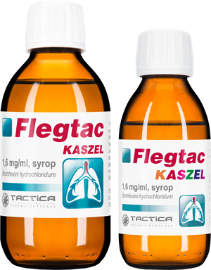 Flegtac Kaszel (Bromhexini hydrochloridum) 1,6 mg/ml, syrop. Pojemność opakowania: 125 i 200 ml. Składniki: 1 ml syropu zawiera 1,6 mg bromoheksyny chlorowodorku. Wskazania do stosowania: ostre i przewlekłe choroby płuc i oskrzeli przebiegające z zaburzeniem wydzielania śluzu oraz utrudnieniem jego transportu. Przeciwwskazania: nadwrażliwość na którąkolwiek substancję czynną lub na którąkolwiek substancję pomocniczą, choroba wrzodowa żołądka i dwunastnicy, nietolerancja fruktozy, wiek poniżej 2 lat. Podmiot odpowiedzialny: TACTICA Pharmaceuticals Sp. z o.o., ul. Bankowa 4, 44-100 Gliwice.